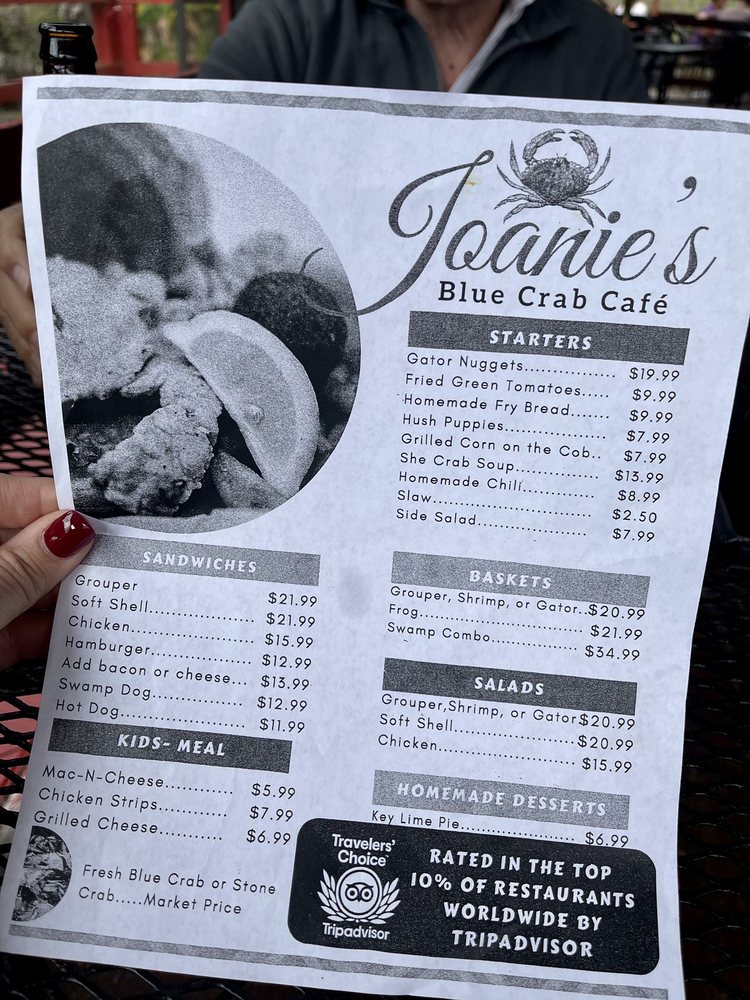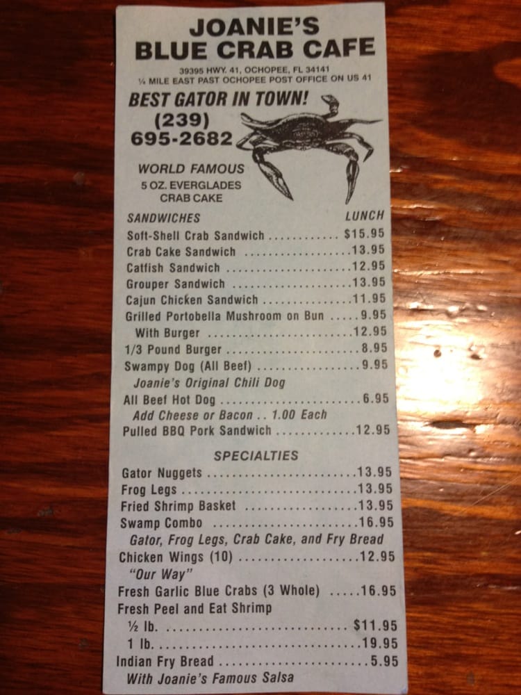 Joanie's Blue Crab Cafe, located in Ochopee, FL, offers a unique dining experience in the heart of the Everglades. Specializing in seafood, this charming spot is a must-visit for locals and tourists alike. The menu features a variety of options, including fried green tomatoes, gator bites, and decadent key lime pie. Customers rave about the friendly staff, laid-back atmosphere, and generous portions. Joanie's nostalgic decor adds to the overall experience, transporting diners back in time to old Florida. While the food may not be mind-blowing, it's well-executed and perfect for a satisfying meal. Whether you're craving classic Southern fare or looking to sample local specialties, Joanie's Blue Crab Cafe is the place to be.